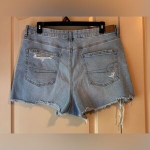 American Eagle Outfitters Strigid Denim Curvy Waist '90s Boyfriend Short women Size 18 Trendy light blue jean shorts with a distressed look. Features frayed hems and classic five-pocket style.