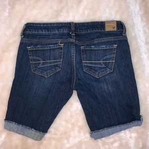 these shorts are a size 0 from american eagle! they are a long bermuda shorts style! they are super cute and stretchy! the button on the front might be rusted (it might just supposed to be gold) but it looks gold and normal! they have been worn so there are some small frays throughout the shorts, but still in super good condition! feel free to ask questions, make an offer, or bundle to save!!!