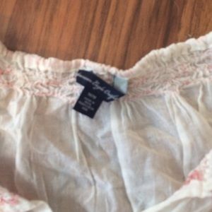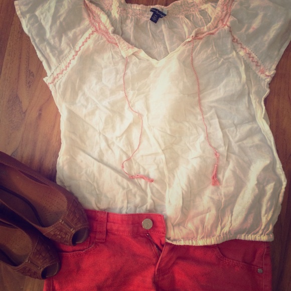 Get ready for summer! Listing is for the top. Shirt is size medium, new without tags from AE, American Eagle and is a sheer white with pink/light coral detailing.