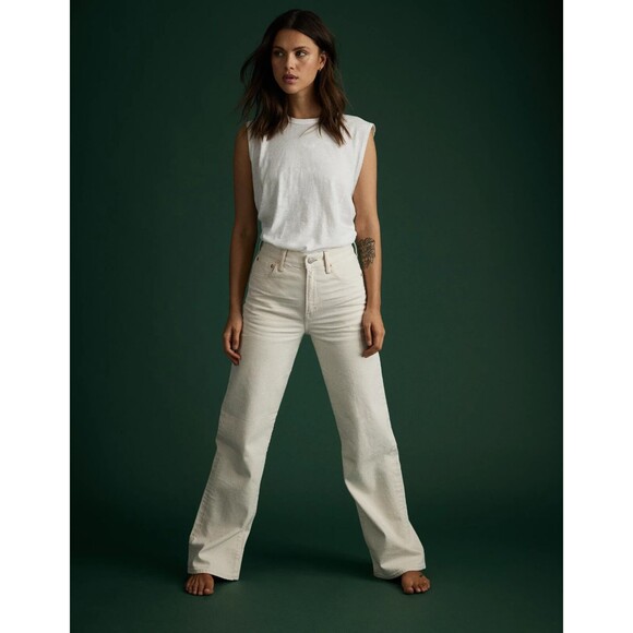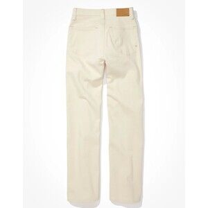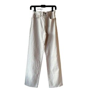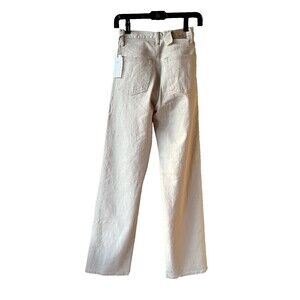 New with Tag $188, AE77 women's The Stovepipe Selvedge Stretch Straight Jeans, size 24 x 33 inch inseam, color: Natural (off-white beige), zipper with button closure, 5-pocket design, straight leg with 19 inch leg opening.