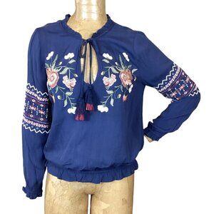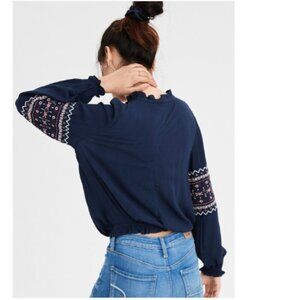 AE/American Eagle BOHO Embroidered Tie Neck Top Long Sleeve S Navy Blue #311J