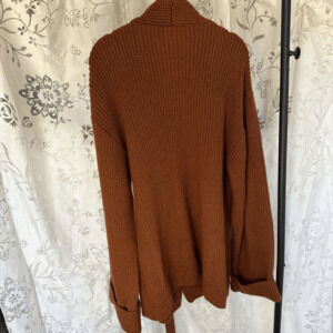 Rust sweater, cardigan, cozy layering, casual chic, boho, autumn essential, warm, textured knit, oversized fit, stylish comfort, versatile, everyday wear, comfy chic, casual, bohemian, rustic, fall layering, earthy tones.