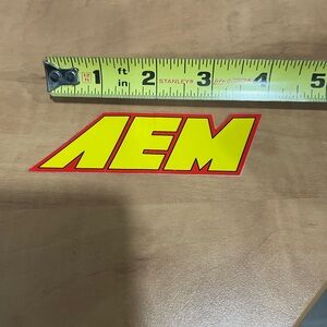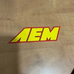 AEM sticker with bold yellow letters outlined in red. Perfect for customization.