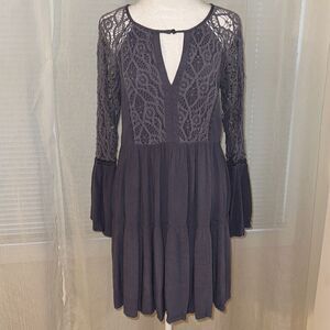 AE M Purple Crochet Lace Overlay Bell Sleeve Tiered Dress front Keyhole Button