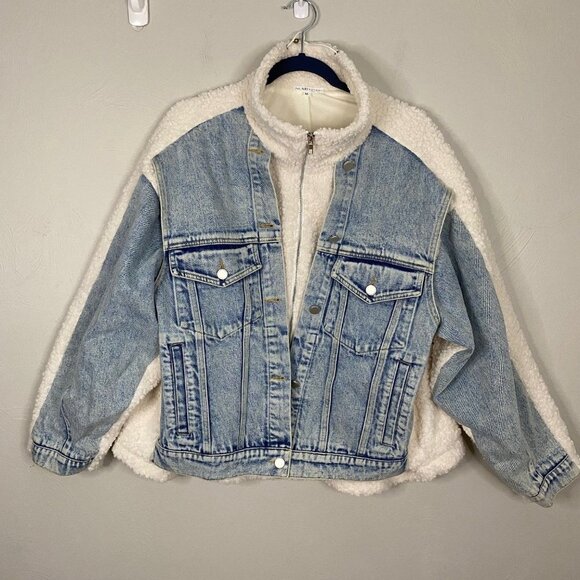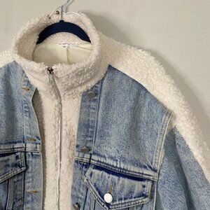 AEMI+CO Doro Denim Jacket in a women's size Medium. The denim deconstructed jean jacket over sherpa is comfy cozy with a full zip front and high collar. Wash by hand in cold. Excellent condition no holes or stains. Soft lining so the sherpa doesn't touch your skin. Very Relaxed fit.