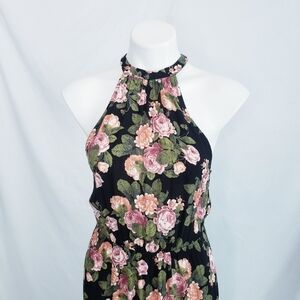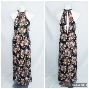 AEO American Eagle Floral Halter Maxi Dress Open Back Black