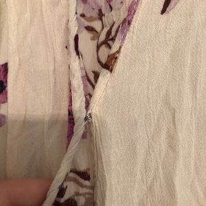 Cream romper with purple flowers. All fastenings are attached. Definitely runs big! Its probably intended to be slouchy, however I would have preferred it not be.