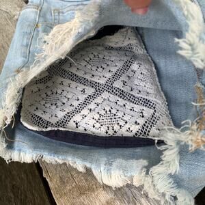 Super cute and trendy! American Eagle Outfitters Hi-Rise Shortie distressed jean shorts with crochet accent peekaboo pockets. Size 4.