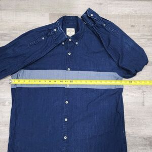The AEO Mens Premium Indigo Classic Fit Denim Shirt in size Large is a versatile and stylish addition to any man's wardrobe. Made from high-quality cotton denim in a classic fit, this shirt features a collared neckline, long sleeves, and a button-up closure. The shirt is machine washable and comes in a timeless blue color with a subtle one stripe pattern, making it suitable for various occasions including travel, parties, casual outings, formal events, and workwear. The shirt also includes one pocket and is perfect for the winter and fall seasons. Crafted by American Eagle Outfitters, this denim shirt is a must-have for the modern man.