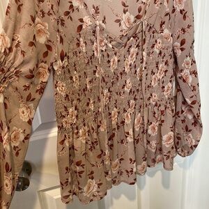 Features loose puff sleeves, fit and flare silhouette, slightly sheer with romantic floral print
