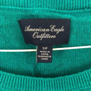 American Eagle scoop neck sweater with pretty blue-green color on top and navy + white stripes on bottom. Great condition! 🌿💫