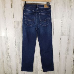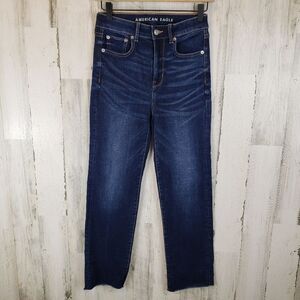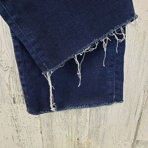 ~ Description: Dark wash blue denim with intentional fading and whiskering, stretchy, 5 pockets, raw/frayed bottom hem