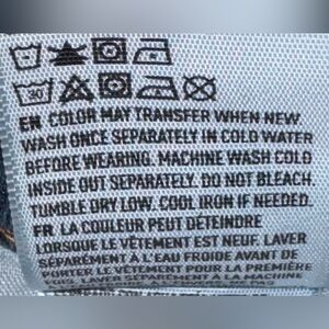 Machine wash cold inside out with like colors. Do not bleach. Tumble dry low. Cool iron if needed.