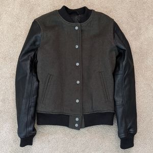 Olive / army green wool-blend bomber jacket with black faux leather sleeves from American Eagle. Quilted interior lining. Two exterior pockets. Snap button closure. Warm and stylish. Worn once, excellent condition.