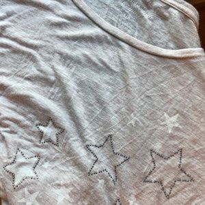 Very lightweight, long sleeve, boatneck shirt from American Eagle. It has studded stars on the front, and scooped shirttail hem. In a pretty heathered tan/pale pink color. Some small pilling, but overall in good condition.