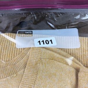 Mustard yellow with white flecks, soft, v-neck, high - low bottom, long. Women's size small. See photos for details and measurements.