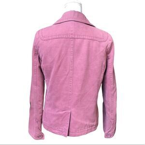 American Eagle Velveteen Soft Touch Cotton Double Breasted Pea Coat Blazer, Mauve Pink Candy Stripe Cotton Lining, Short Fitted Style and Vented Back for a tailored look.
