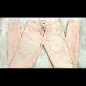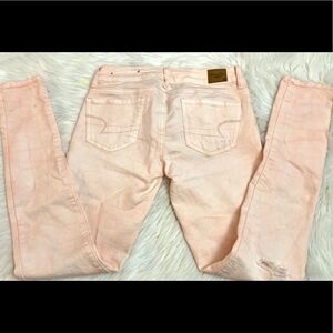 Ladies salmon colored denim distressed skinny jeans by American Eagle Outfitters. Ladies size 0. 28” inseam.