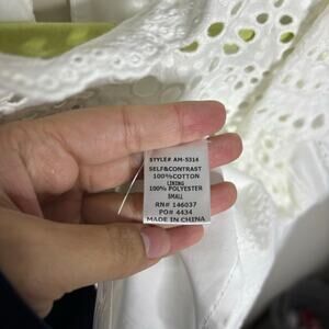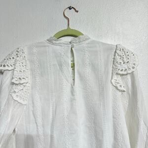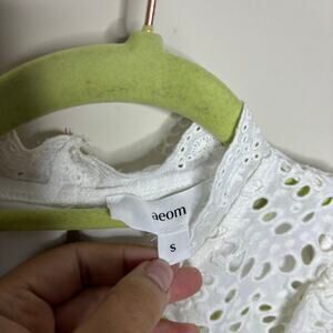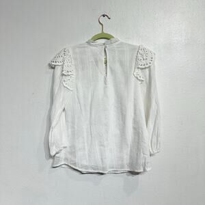 Small white blouse by Aeom in excellent preowned condition. Approximately 23" length, 17.5" bust, 17.5" sleeve length.