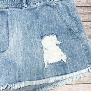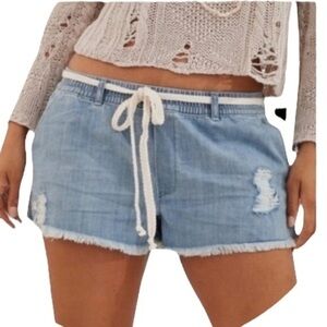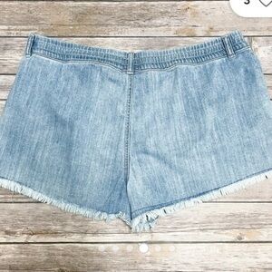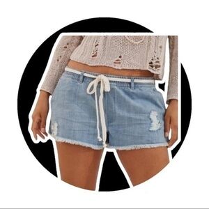 AERIE Denim elastic waist shorts. Distressed lace details fringe bottom size XL.