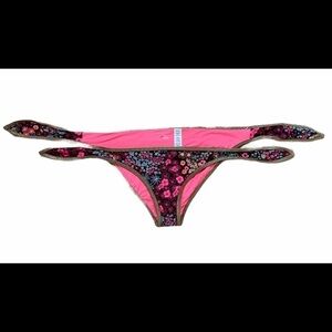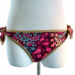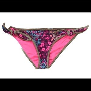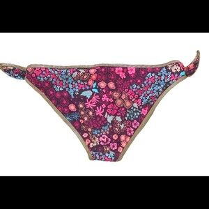 Gorgeous vibrant floral hipster American Eagle Aerie bikini bottoms from Aerie. They have a maroon/brown base with pink and blue floral pattern. Luxurious gold trim and adorable side ties elevate this basic hipster bottom into something special. Fully lined and side ties mean it’s infinitely adjustable. Price tag not attached but still have liner so I’m saying New with tags.