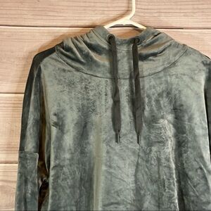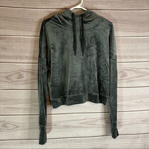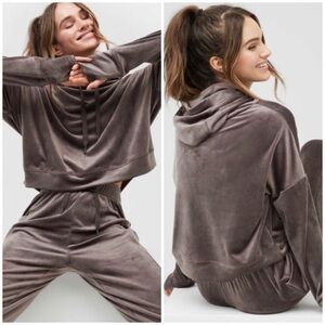 In excellent used condition no rips, tears or stains. The Details Kick it in these after your next sweat sesh. Cozy is the best kind of after party! The fabric: Dreamy-soft velour (inside and out!) The deets: Front pocket. Thumbholes. Hooded. The fit: Easy fit. Cropped.