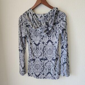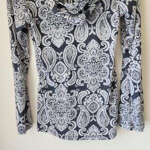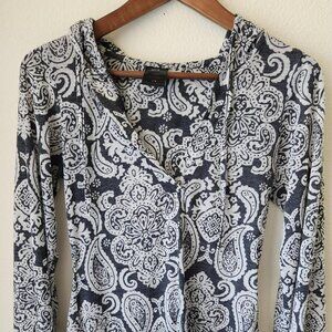 AERODYNAMICS paisley long sleeve hoodie navy and white V-neck pullover Sz S Boho