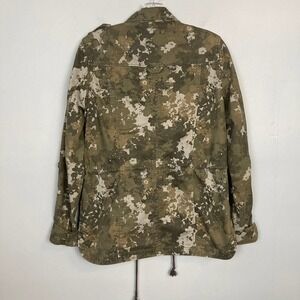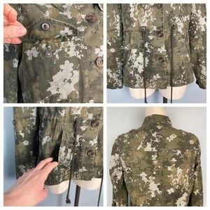 Aeropostale Camouflaged Military Style Utility Jacket Shacket 100% cotton Size S Roll Tab Sleeves. Button front closure. Decorative shoulder button tabs. Army green camo. Snap closure pockets on chest. Drawstring waist. Slant Pockets. Machine wash, tumble dry. In great, pre-owned condition. 100% cotton, no stretch. Measurements taken flat: pit to pit: 18.75", sleeve length unrolled: 26", rolled, 18", shoulder to hem length: 26".