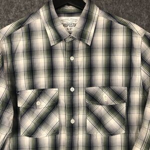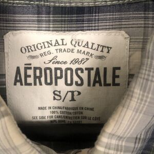 This Aeropostale women's boyfriend shirt is a white and gray plaid button-up made of cotton. It features a collared neckline, long sleeves, and flap top pockets. The shirt is designed with a classic/fitted sleeve style and a regular fit in size S/P, suitable for petites. It is machine washable and suitable for travel or casual wear, with a Western, country chic, and outdoor theme. The versatile shirt is ideal for all seasons.