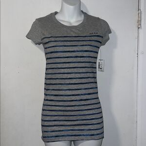 NWT! Crewneck tshirt with shorter than normal sleeves for that typical Y2K look, form fitting, grey with blue stripe pattern, washable cotton. Size small, measures 15” from armpit to armpit and 25” from top of shoulder to bottom hem.