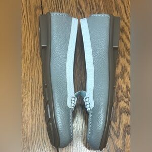 These AEROSOLES loafers feature a soft mint green hue complemented by white and gray detailing, offering a chic and casual look. The silver-toned ornament adds a touch of elegance, while the comfortable flat sole ensures all-day wearability. Crafted from leather, these shoes are perfect for everyday style.