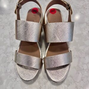 Chic metallic silver sandals with a sturdy block heel. Ideal for stylish comfort.