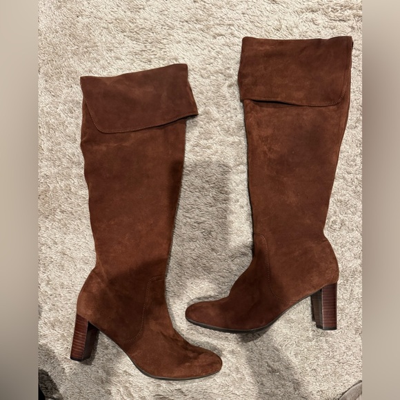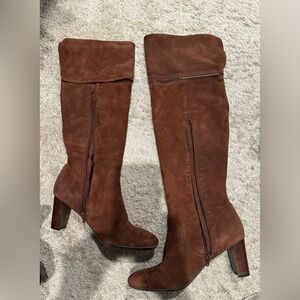 Chic over the knee boots in rich brown. Smooth suede finish. Perfect for versatile styling.