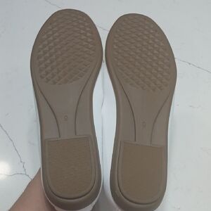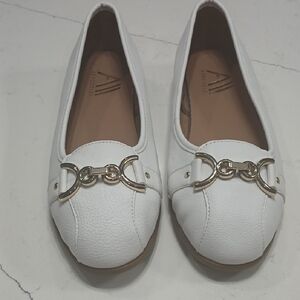 Chic white leather flats featuring a gold metal detail. Ideal for versatile styling.