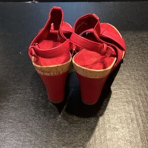 Chic and comfortable deep red/maroon sandals by AEROSOLES. Ideal for casual outings. Plush insoles, minimal signs of wear, adjustable back strap, cork accents, great transition to fall.
