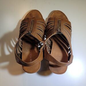 AEROSOLES WEDGE STYLE OPEN TOE ANKLE STRAP SANDAL SIZE 9 2/1M COLOR BROWN MADE WITH ALL MAN MADE MATERIALS ZIPPER CLOSURE IN THE FRONT THIS ITEMS IS PRE-OWNED EXCELLENT CONDITION WITH ONLY LIGHT SIGNS OF WEAR IF ANY CHECK THE PICTURES (NO TRADES REASONABLE OFFERS PLEASE BUNDLE FOR BETTER DEALS