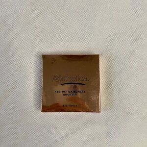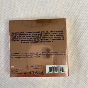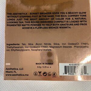 -The Aesthetica-Sunset Bronzer gives you a beachy glow without stepping foot in the sand. The rich, Coppery tone lends just the right amount of color for a natural looking tan. This round mirrored compact is loaded with pigmented matte powder to help both amateurs and pros achieve a flawless bronze warmth.