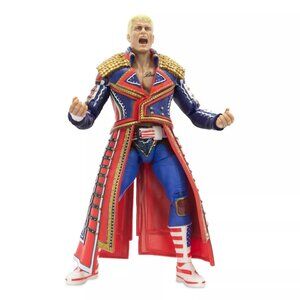 Includes 12 pieces: three interchangeable head scans, a red, blue, and gold jacket with molded studs, two interchangeable lower legs, one with red, white, blue, and gold 'American Nightmare' style tights and boots, and the other with gold and red tight and white boots with 'American Nightmare' symbols! This figure also includes two weight belts, a removable black 'Cody Rhodes t-shirt, interchangeable arms, and an AEW microphone accessory!