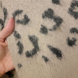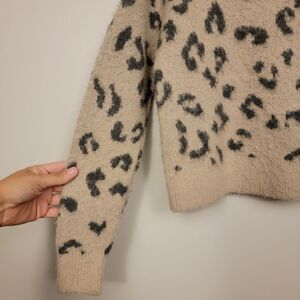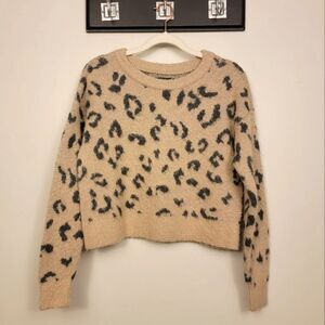Tan cropped animal print sweater, thick knit material that is very soft and fuzzy.