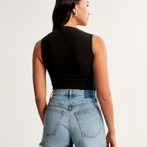 Slim-fitting top in double-layered cotton-blend seamless fabric and cropped length, featuring ruching details along the bodice and portrait neckline.