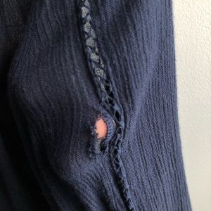 Navy, long-sleeved A&F blouse. Lightweight material, cute lace detailing on sleeves and neckline. V-neck and open back design with tie in the back. Minor tearing along the sleeves that could be easily sewn, damage is reflected in price (3rd picture shows where I had sewn the same damage on other sleeve)