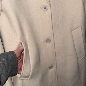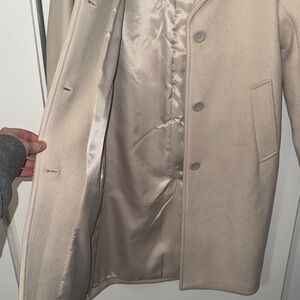 Worn once in like new condition (no flaws). Size small, cream color. Coat is 100% Polyester.