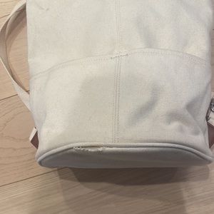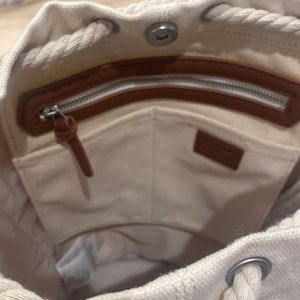 A&F Drawstring Bucket Backpack. Snap buttons closure. Two front open pockets, drawstring closure,one zippered pocket inside with two own pockets. Adjustable straps. Small tear on bottom front (last photo).