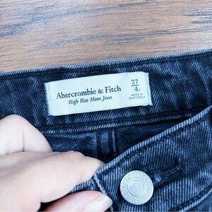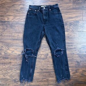 A&F • High Rise Mom Jean black denim ripped knees distressed raw frayed ankle