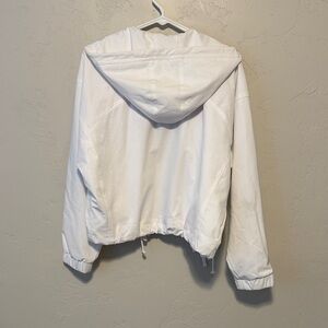 Zipper closure with cinch at bottom of jacket to create a fitted or cropped look.
