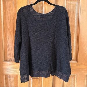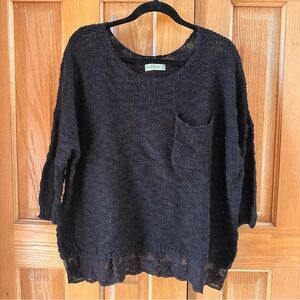 Oversized knit sweater with a boat neck, pocket detail, and lace hemline. In excellent condition.