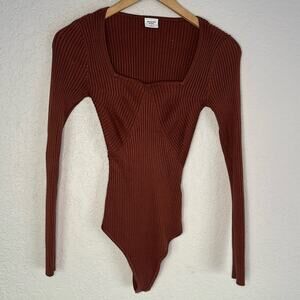 A&F Ribbed Dark Brown Bodysuit Square Neck Thong Neutral Minimalist Long Sleeve