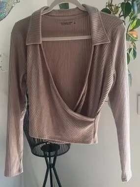 Soft ribbed wrap-front top with collared neckline. Long sleeves and cropped hem. Subtle mauve-taupe color. Easy, flattering silhouette.