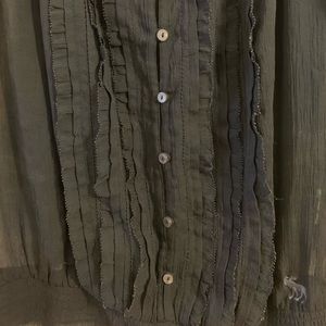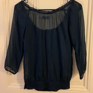 Semi see through top, perfect with laced/plain tank top (or just a black bra) underneath! The fabric is very soft and fine, and this top can be worn off-the-shoulder. :)
