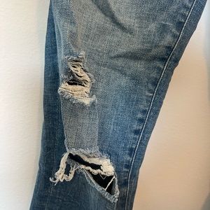 Our high rise super skinny jean with figure-defining style and built-in stretch for superior comfort. This is a form-fitting silhouette from top to bottom and is cropped to show a little ankle–and your favorite shoes. Features a light wash, knee blowout details and distressed hem. Imported.